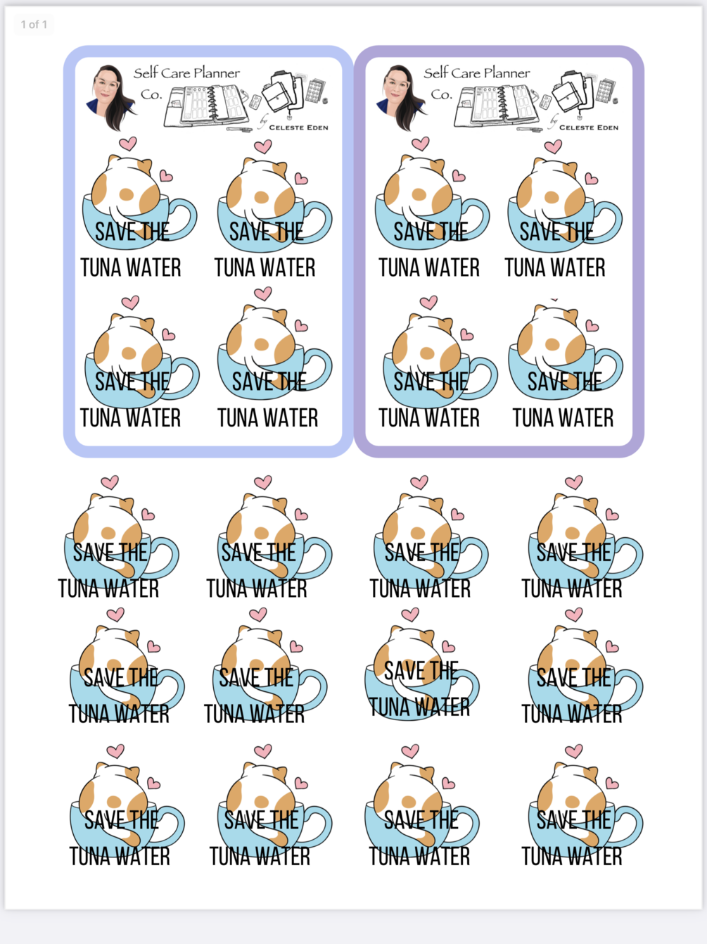 For cats who love tuna water! 2 sheets are pretty for your sticker book plus a dozen more below- as ink saver. 4 more stickers fit with boxes/ brand name gone. Hide these behind the pretty sheets.
